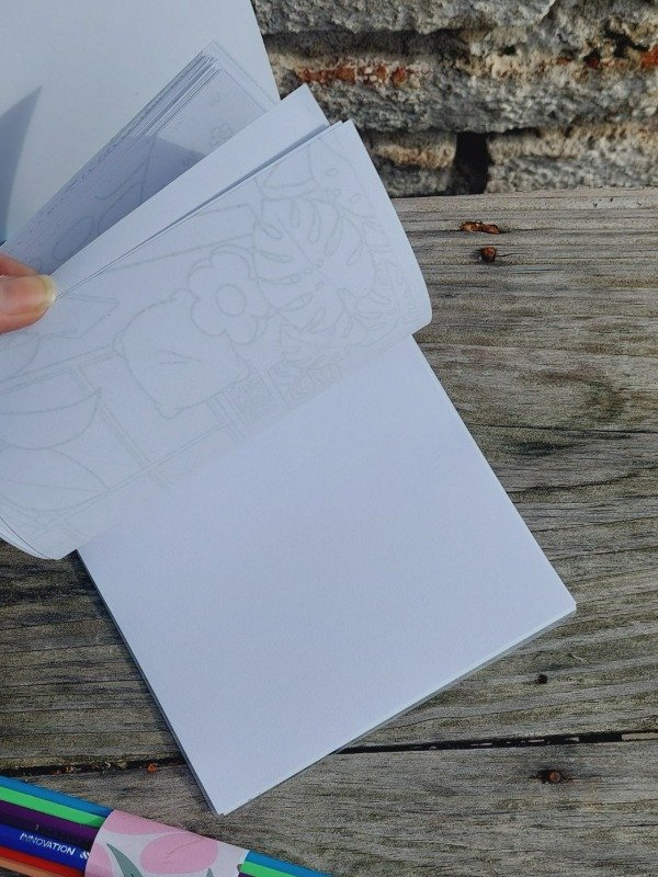 Contiene un cuaderno con 30 hojas distintas, 10 hojas lisas y 12 lápices de colores.
