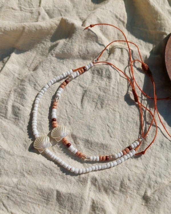 Hilo encerado, mostacillas y ostra de acrílico/plastica